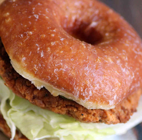 wHAT DO YOU GET WHEN YOU FRY A BUTTERMILK BATTERED CHICKEN THIGH, ADD THREE PICKLES, MAPLE MAYO AND PLOP DOWN ON LETTUCE AND A SAVORY DONUT BUN?